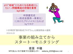 次に、特定非営利活動法人いわて地域づくり支援センター常務理事の若菜千穂氏に、「事業の組み立てから、スタート→モニタリングまで」というテーマでミニ講義をしていただきました。多くの具体的な内容が提示されましたが、特に、アンケート調査をする際は必ず仮説を立て、仮説に基づいて内容を組み立てること。また、先行事例を少なくとも10例は調べるという点は、今回応募を検討されている方にも是非意識していただきたいと感じました。