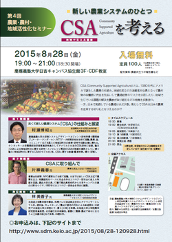 2015年8月28日(金)、慶應義塾大学日吉キャンパス協生館3階CDFルームにおいて、「第4回農業・農村・地域活性化セミナー『新しい農業システムのひとつCSAを考える』」と題したセミナーが開催されます。