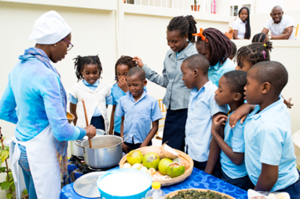 料理史ワークショップで交流する生徒たちと調理師。20…